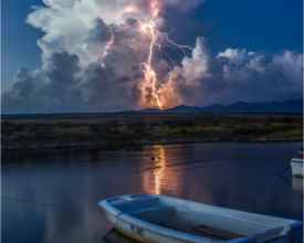 Postive lightning strikes from a distant cumulonimbus over Biograd as seen from Pag island, 6.10.2021